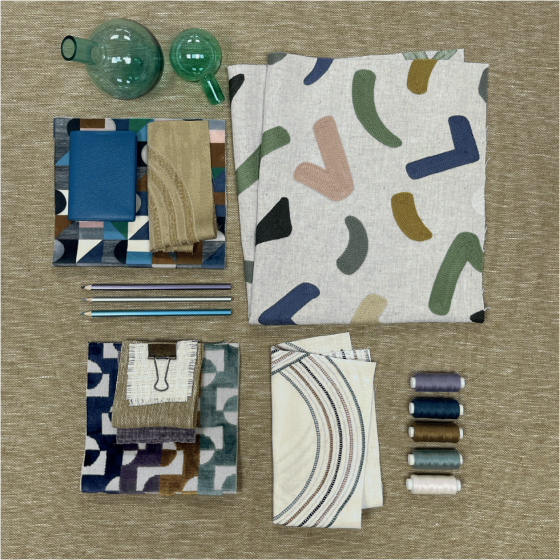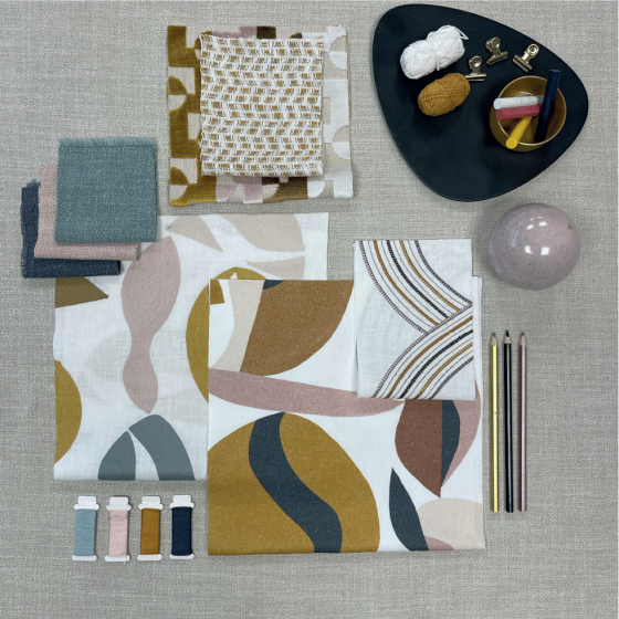 Soft and reassuring dreamlike universe inspired by abstract art…The colours awaken organic shapes, tinted with a pretty naivety, a delicate and enchanting fragility. The mineral materials create an atmosphere that is at once modern and timeless, the impression of a bright dream…