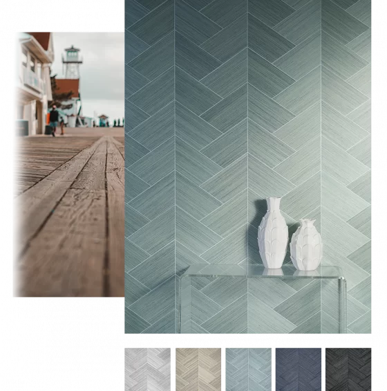 Inspired by a seaside boardwalk, this large-scale chevron mosaic pattern adds textural interest to your walls. Handcrafted by artisans, each piece of grasscloth is cut and placed atop coordinating grounds before it is laminated, inspected, and packed to perfection.