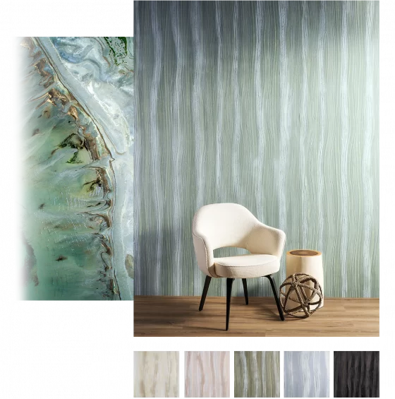 Immerse yourself in this layered, undulating pattern with luxe metallic accents. Authentic wood veneer is washed in color, inlaid on gold or silver grounds, and laser cut for a stylish statement.