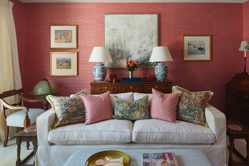 Throughout, we’ve seamlessly integrated cherished artworks and timeless antiques, revitalising each space with relaxed slipcovers and sumptuous upholstery in exquisite textiles. A delightful botanical wallpaper enlivens a petite powder room, while the snug, ensconced in coral pink raffia wallpaper, beckons as a cosy haven on chilly winter nights.